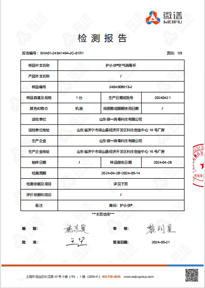 護(hù)小俠空氣消毒杯檢測(cè)報(bào)告